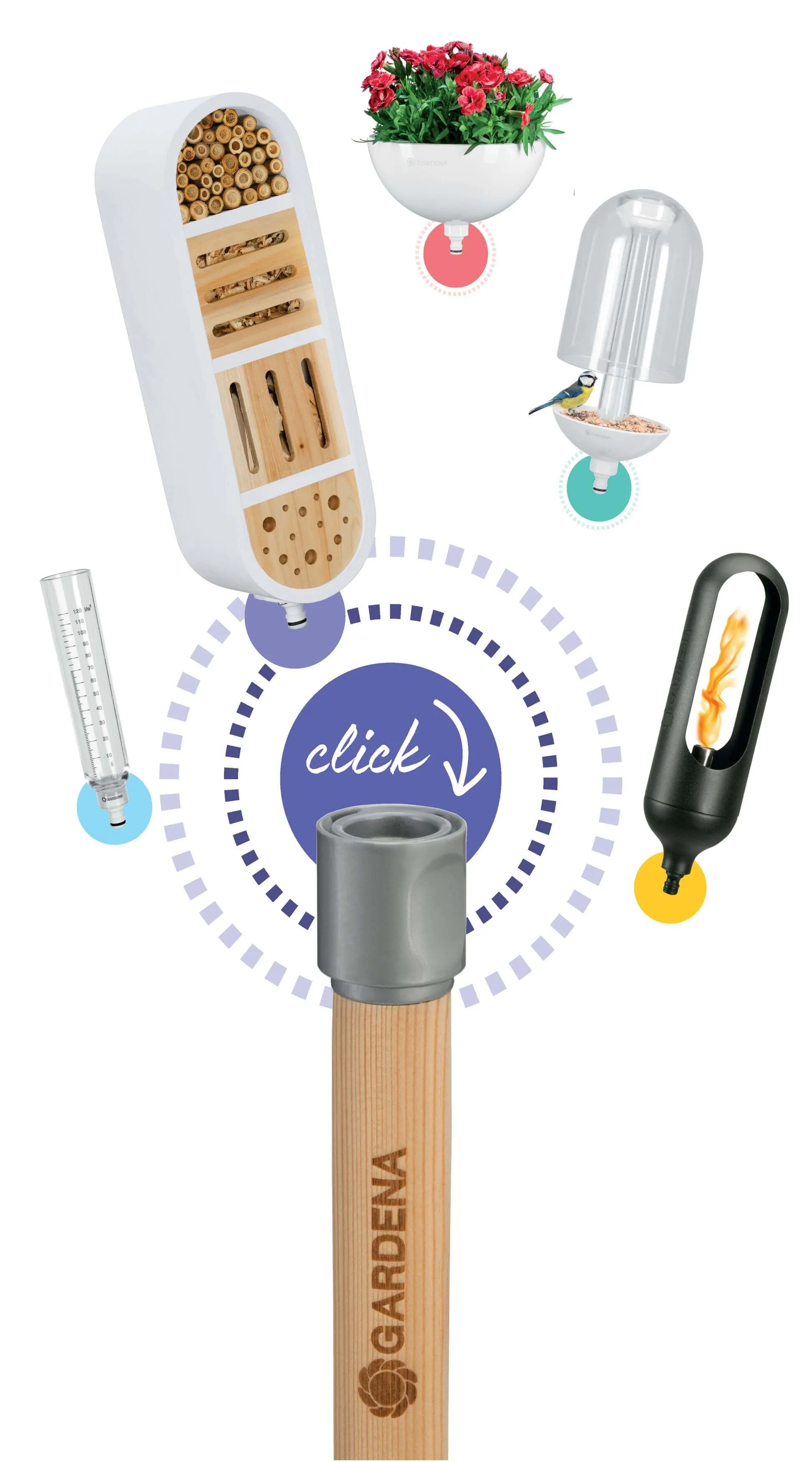 Отель для насекомых Gardena ClickUp! подключается к рукоятке ClickUp! одним щелчком.