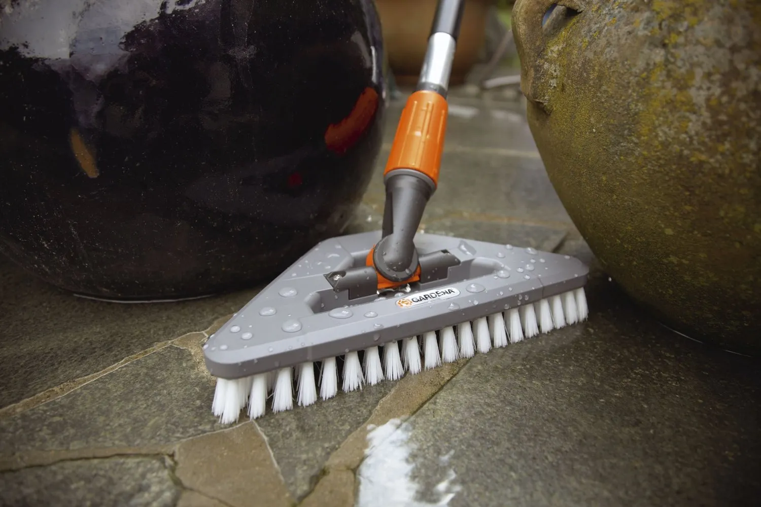Универсальная щетка с жесткой щетиной на поворотном шарнире (360 градусов) поможет быстро очистить грубые поверхности (внутренние дворики, ступеньки, дорожки). Рекомендуется использовать совместно с водопроводящей ручкой Gardena. Треугольная форма рабочей поверхности позволяет щетке удалять грязь из углов и щелей.