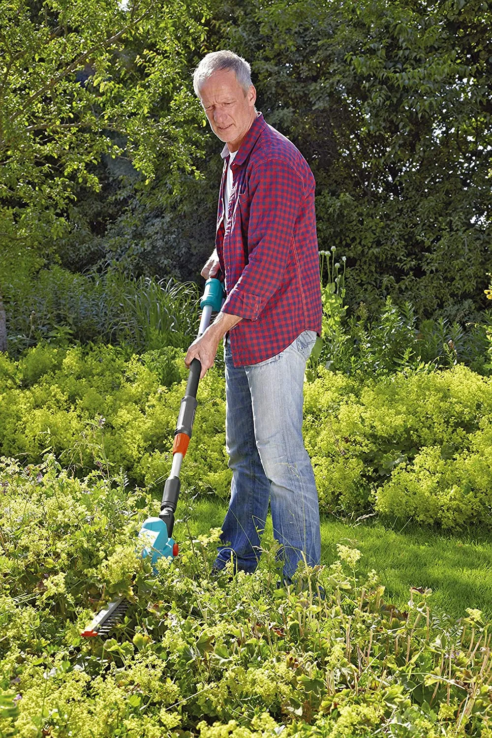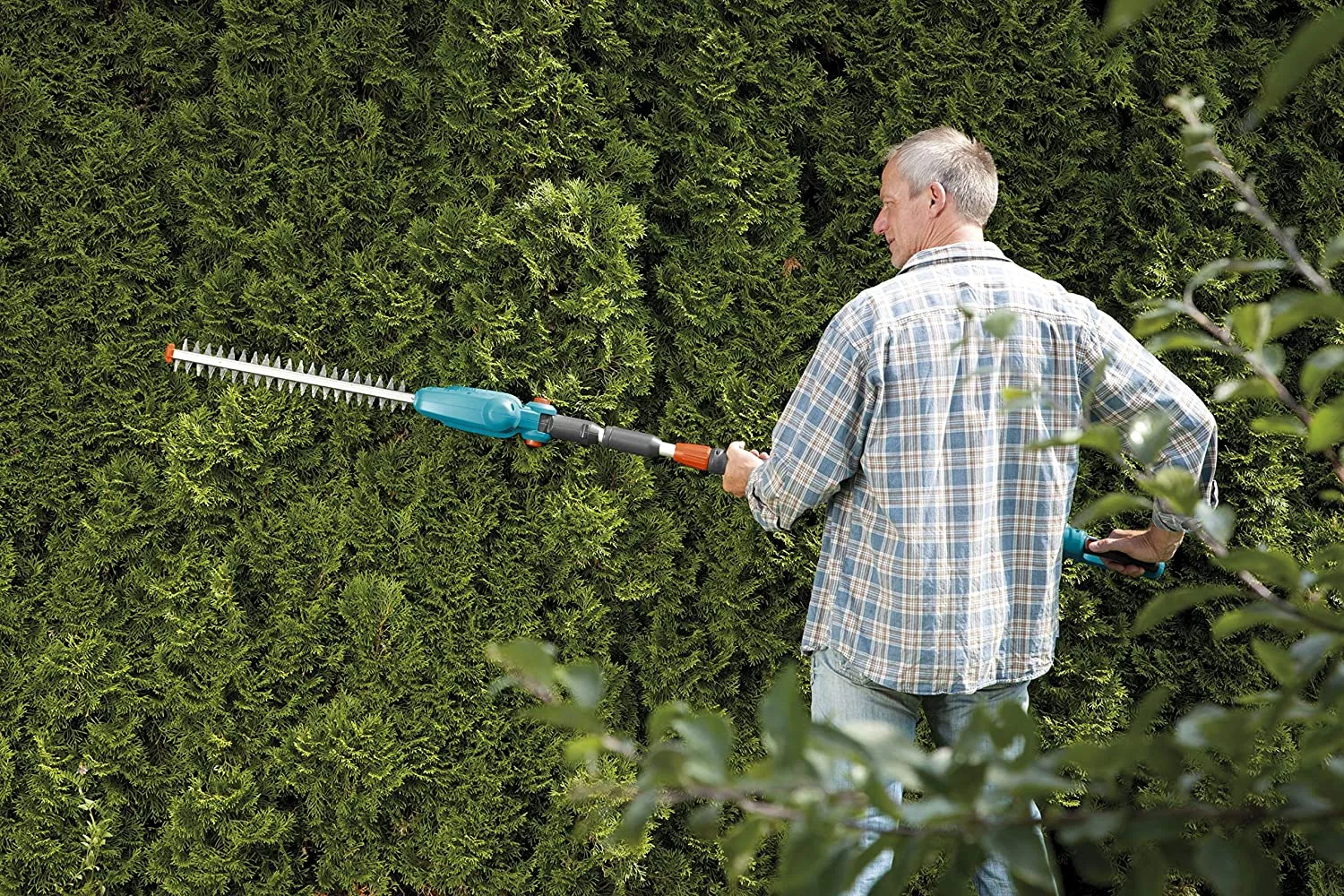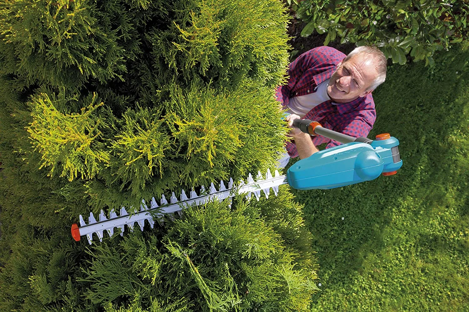 Телескопические ножницы весят 3,4 килограмма со вставленной батареей, их рукоятка эргономична и имеет идеальный центр тяжести. Это означает, что они удобно и надежно помещаются в вашей руке, даже когда телескопическая ручка полностью выдвинута, что позволяет вам использовать полный трехметровый диапазон. Вам нужно подстричь живую изгородь? Не проблема: режущая часть ножниц а может быть наклонена - функция, которая также очень удобна при резке на уровне земли. Вам больше не нужно наклоняться, и это легко на коленях.