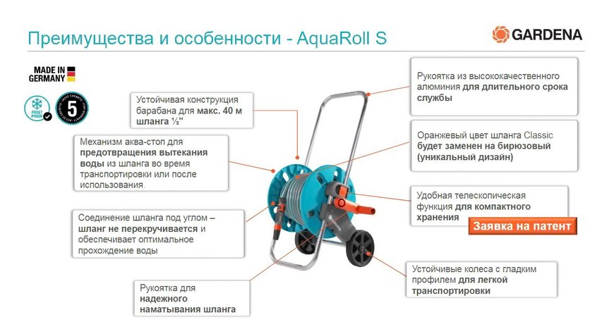 Регулируемая по высоте рукоятка, подсоединение шланга под углом, защита от течи, регулируемое положение рукояки для намотки шланга (справа/слева)